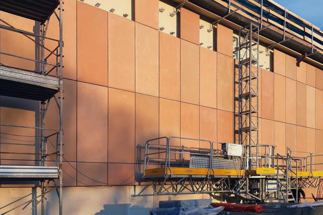 Infine, la lavorazione finale dei pannelli di facciata tramite un intervento di microsabbiatura superficiale ha donato un ricercato effetto di velatura e marezzatura, mostrando ancora una volta le innumerevoli possibilità di personalizzazione della finitura superficiale del materiale cementizio.
