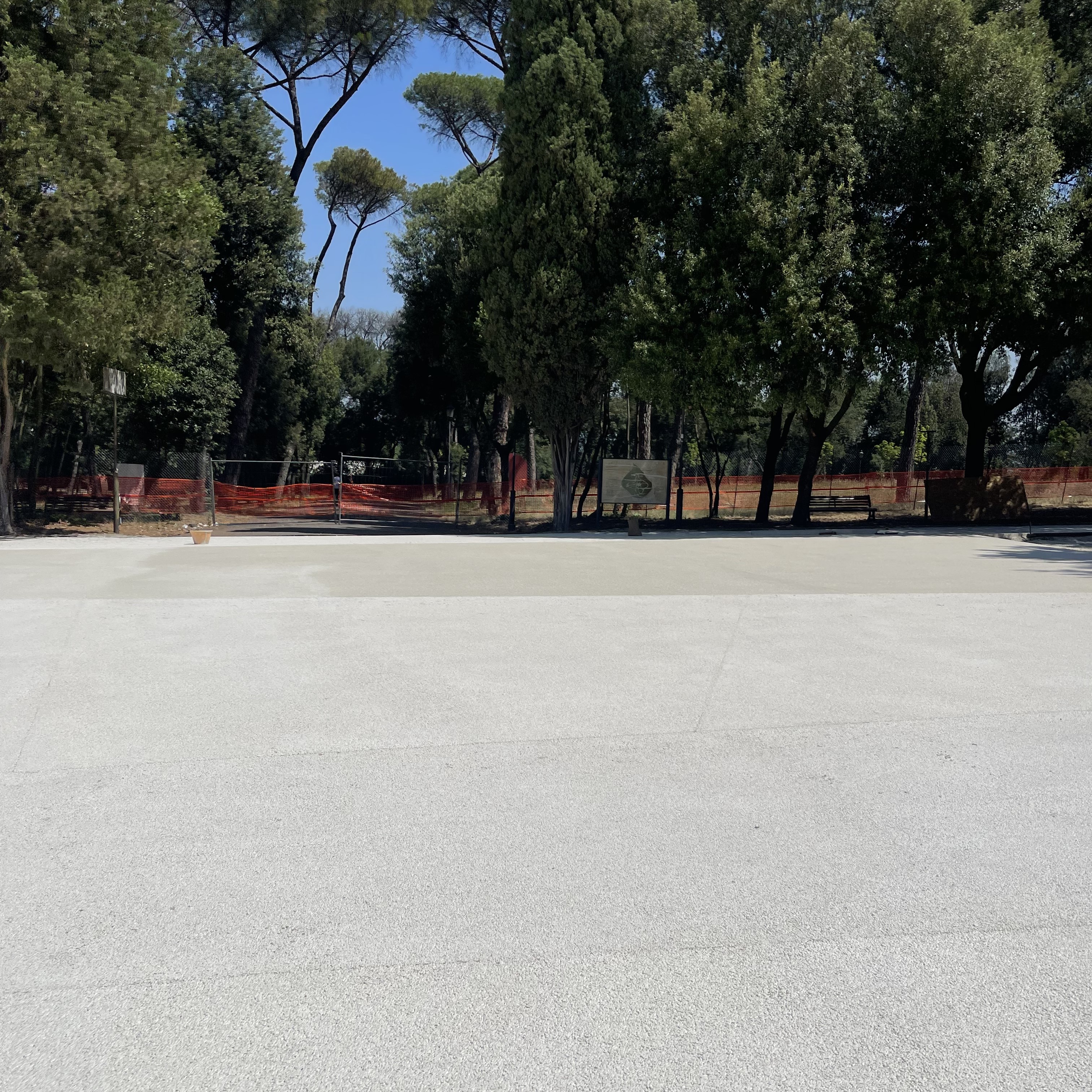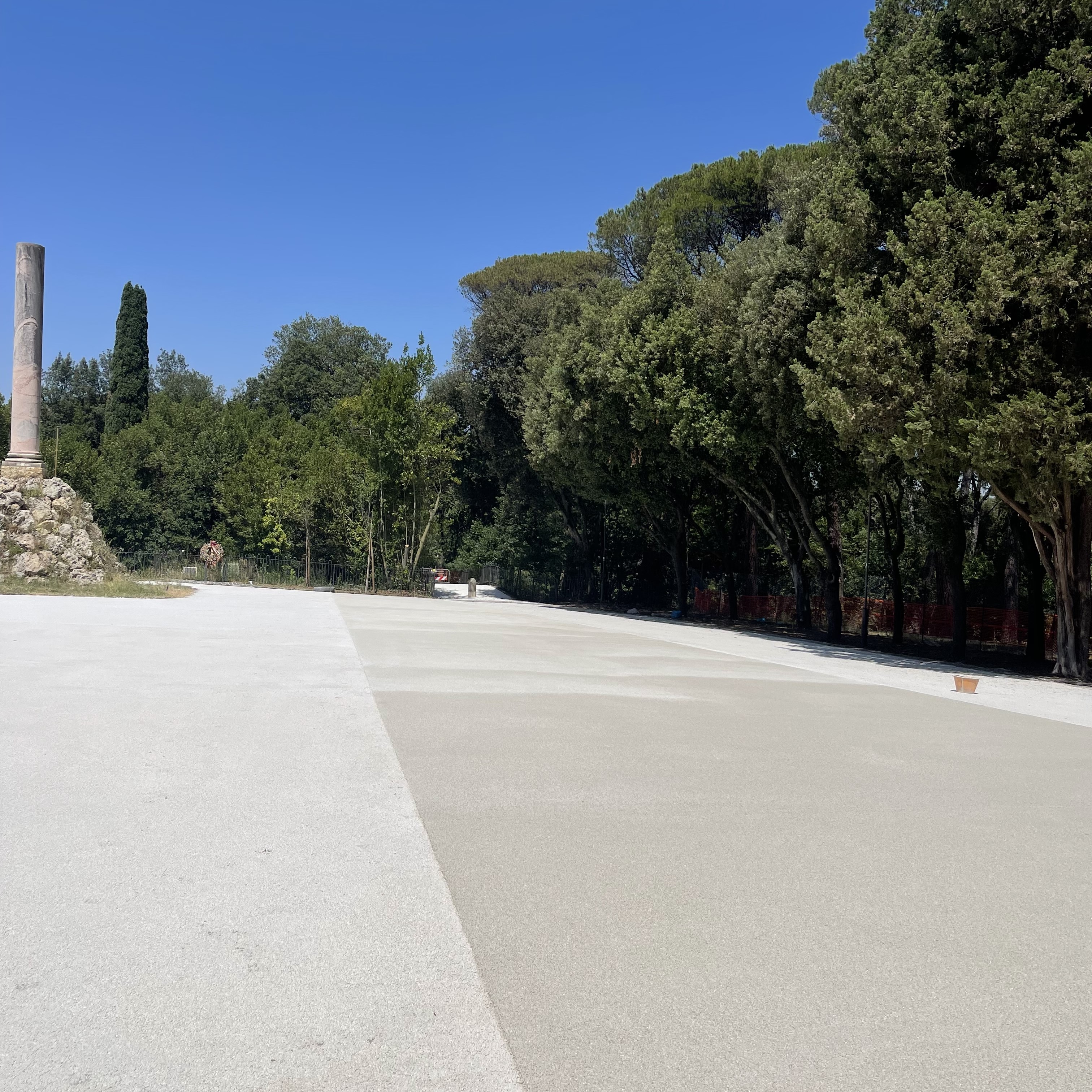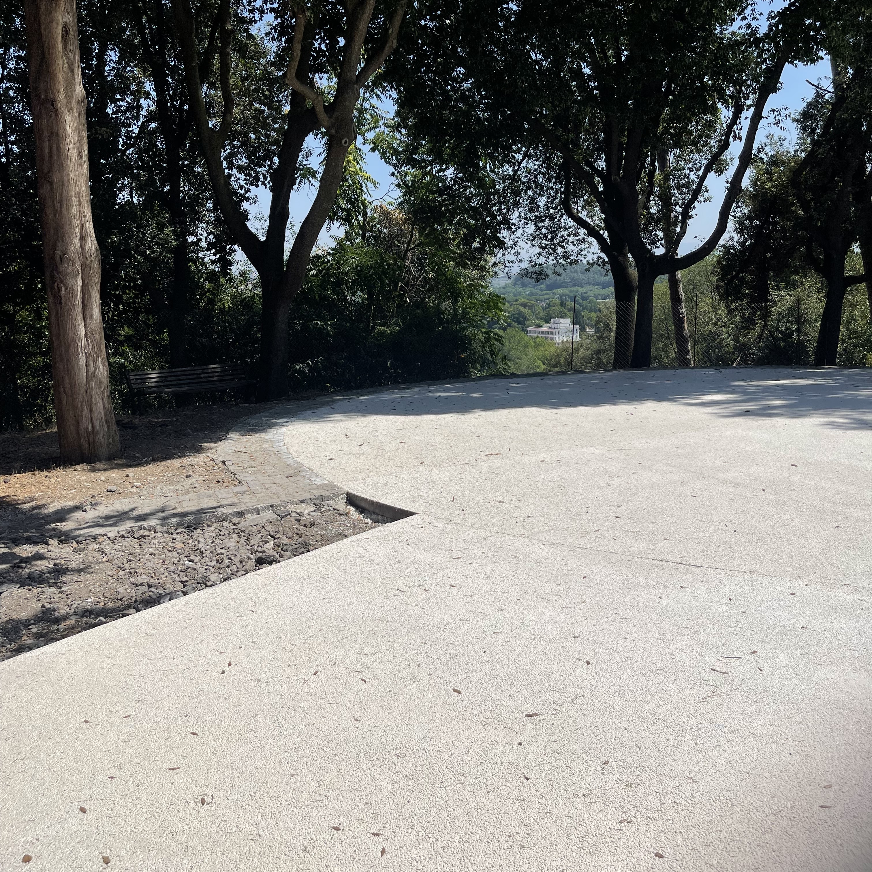 Sono stati rimossi gli strati di asfalto deteriorato e sostituiti con una pavimentazione più coerente sotto il profilo paesaggistico e ambientale. La scelta è ricaduta su i.idro DRAIN BIANCO, un calcestruzzo drenante consolidato che unisce elevate prestazioni tecniche — in termini di durabilità, accessibilità e gestione delle acque meteoriche — a una finitura visiva capace di richiamare, senza replicarne le criticità, la texture della ghiaia storica. In linea con la Strategia di Adattamento Climatico di Roma Capitale, la nuova pavimentazione garantisce un’elevata capacità drenante e un’alta riflettanza solare, contribuendo in modo concreto alla mitigazione dell’isola di calore e all’evapotraspirazione del suolo”. Anche dal punto di vista estetico, il materiale si integra armoniosamente nel paesaggio: il suo colore chiaro si amalgama nel tempo con aghi di pino, foglie e sedimenti naturali, assicurando uniformità cromatica, durabilità e una significativa riduzione degli oneri manutentivi.