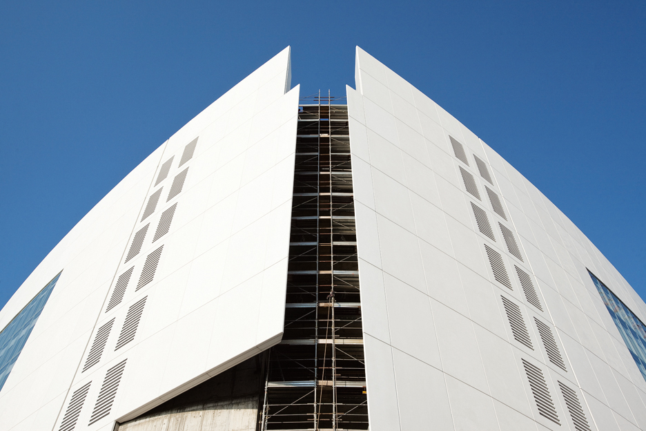ed inclinazione differenziata, da un lato per far leggere in modo pulito il disegno orizzontale della feritoia, dall’altro per gestire l’acqua e portarla verso l’interno in modo tale da essere in sintonia con la logica dell’autopulizia, che è un po’ l’imprinting della materia prima utilizzata, il TX Active®. Quindi pulizia come meccanismo naturale attivato dalla luce solare, supportata da meccanismi di geometria, tale da ottenere una lettura pulita del disegno senza le svasature tipiche delle finestre di tipo classico. Stesso studio anche nel giunto, dove oltre alla maschiatura particolare è stato realizzato anche un giunto di decompressione che funge da camera di decompressione per evitare spostamenti dettati dal vento, oltre a servire anche come seconda barriera di gocciolatoio perimetrale interno per convogliare e dirige l’acqua dove e come voluto. L’ingresso, con la vela che racchiude la facciata per un’altezza di ca. 40 m, è l’elemento più architettonicamente importante, per il suo rapporto con la città: questa facciata non nasconde alle sue spalle un edificio, ma pone in rapporto la città e le torri del complesso. Su tale facciata possono anche avvenire, attraverso maxi schermi, proiezioni digitali di immagini sia della vita interna del complesso sia viceversa della città. Le rastremature terminali della vela e di altre porzioni alte di edifici, sono state un’altra sfida progettuale in quanto si è dovuto ottenere una finitura bifacciale soprattutto negli elementi d’angolo rastremati; Styl-Comp ha quindi ideato un meccanismo di getto che non seguisse la logica dell’orizzontalità tipica della tecnologia della prefabbricazione, ma si è avvalsa di una tecnica di pompaggio con pompa progettata su misura per questo progetto, così da realizzare la finitura bifacciale, e assecondare i desiderata progettuali che erano quelli di dare questo senso di leggerezza, di rastremazione,di rendere appuntita la parte terminale a sbalzo che si libra nell’aria e riesce ad esprimere tutta la sua bellezza. Rispetto ai progetti precedenti, questo complesso nasce già nel terzo millennio e quindi tiene conto di tutta una serie di esigenze di carattere eco-progettuale che già hanno trovato riscontro nella progettazione Morisi-Gantes: tetto verde sulle parti piane, inizialmente previsto solo per le parti a vista dall’interno degli edifici, e che è stato poi ampliato anche ai tetti alti non in vista; i pannelli di facciata vetrati prefabbricati a cellule che, nel rispetto delle normative schermanti, abbassano notevolmente il consumo energetico sia invernale perché permettono l’ingresso della luce solare in tutta la facciata sia estivo in quanto ombreggiando i locali non fanno entrare calore.